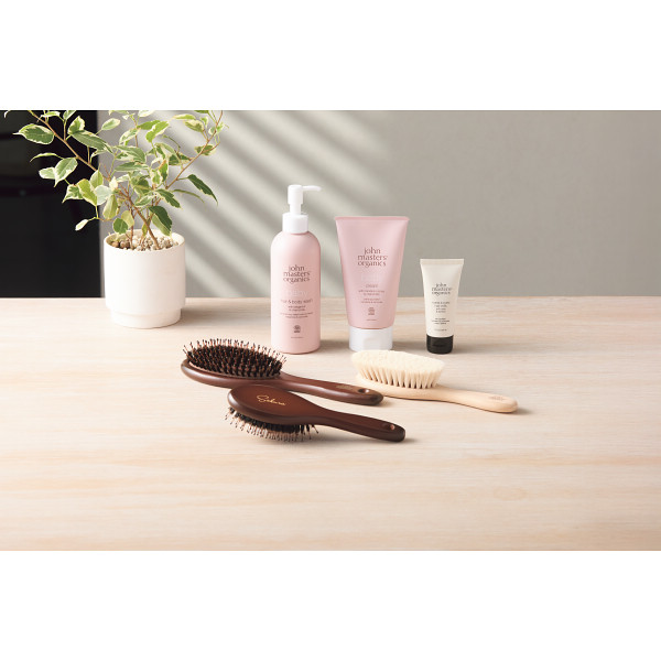 マイナスイオンを放つトルマリン配合のイオン毛と、天然猪毛の混合でできたブラシ。やさしくブラッシングするだけでキューティクルを傷つけることなく整え、寝起きのもつれやすい髪も解消。また、毛が太く、広がりの気になる髪質をなめらかでまとまりやすい髪に仕上げ、サラサラな輝くツヤを与えます。竹製の持ちやすい太さとフィット感のハンドルで、効果的なスタイリングを可能にします。