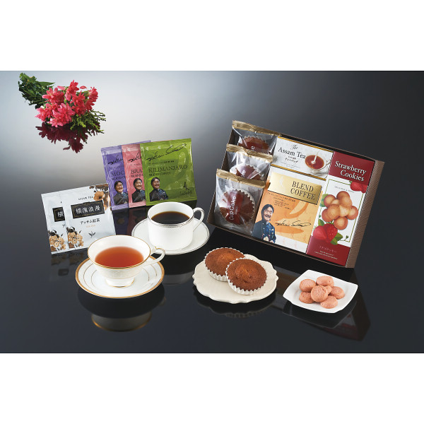●坂井宏行シェフ監修ドリップコーヒー(ブラジルブレンド・モカブレンド・キリマンジャロブレンド×各1)、イチゴクッキー30g×2、アッサム紅茶ティーバッグ2g×2、カップケーキ(メープル)×3
