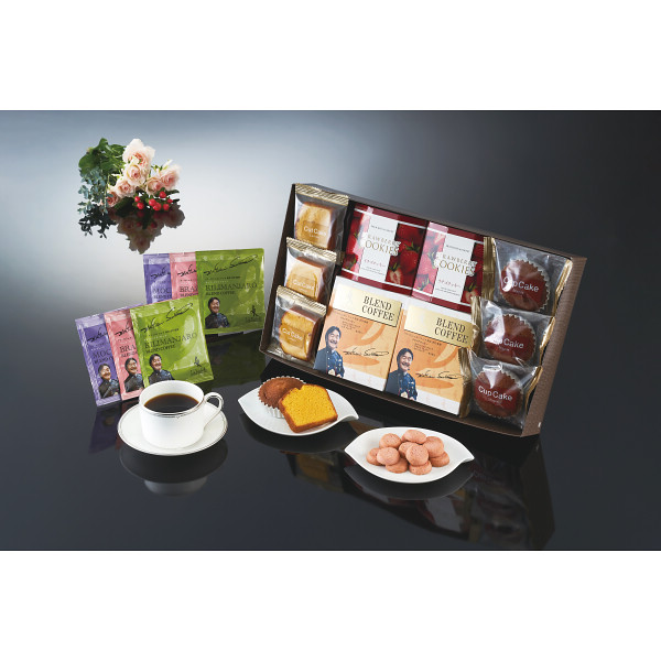 ●坂井宏行シェフ監修ドリップコーヒー(ブラジルブレンド・モカブレンド・キリマンジャロブレンド×各1)×2、カップケーキ(メープル)・カットケーキ(レモン)×各3、イチゴクッキー50g×2