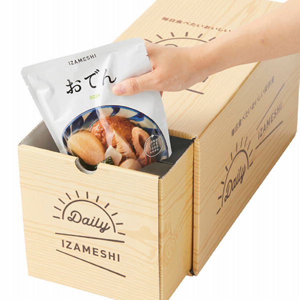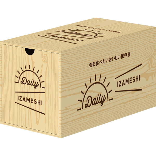 「デイリーイザメシ」は1人3日分の保存食セット。ごはん7種、おかず9種、パン3種、スイーツ2種が各1個、合計21個入っています。ボックスは普段使いができる引き出しタイプ。保存食というと棚の奥にしまわれがちですが、シンプルで明るいデザインなので、インテリアに自然に溶け込みます。食べたら補充するローリングストックにも便利です。